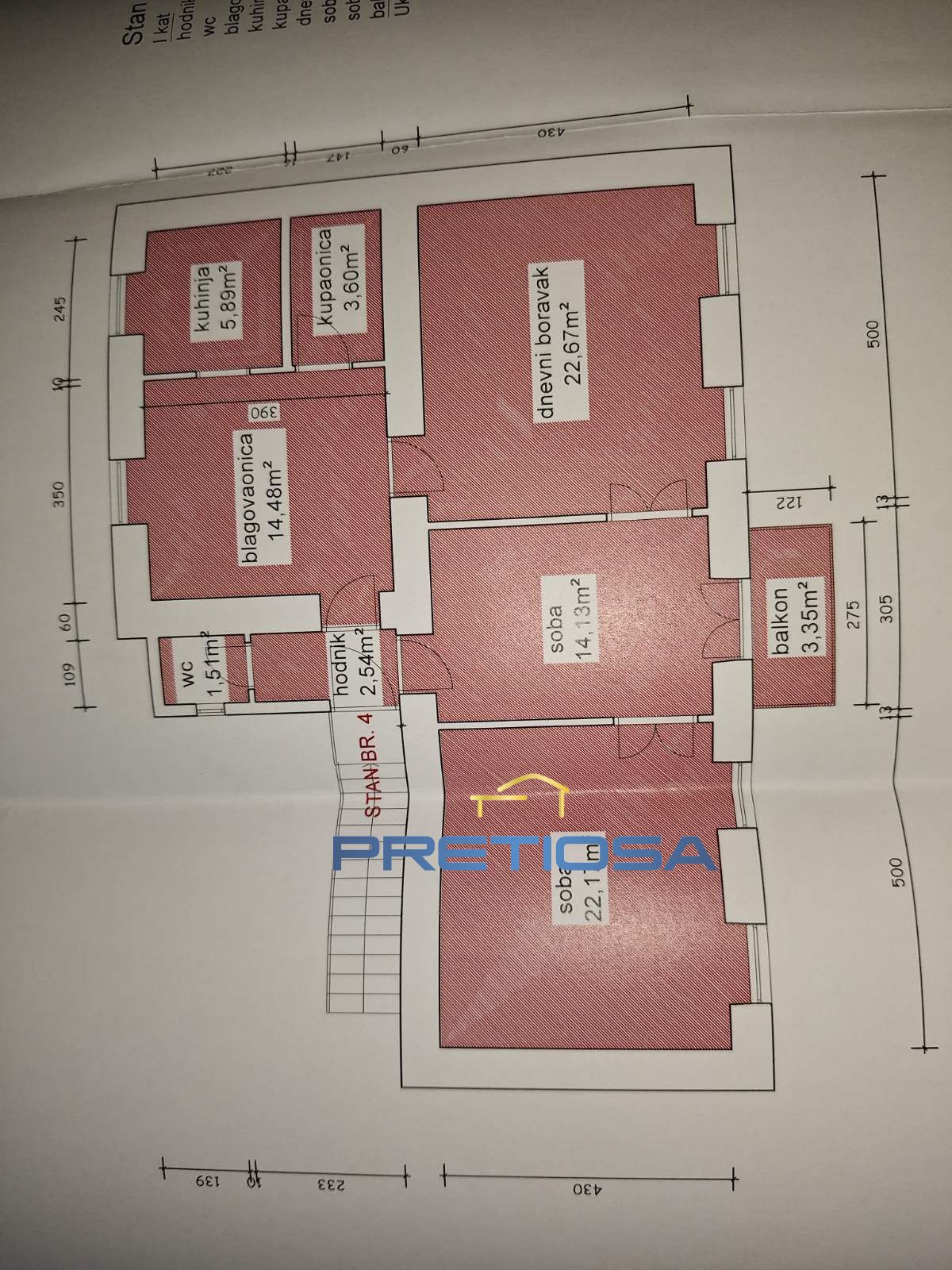 površine 95 m². Nalazi se u manjoj kući, te zauzima cijelu etažu i ima odvojen ulaz. Ista se sastoji se od ulaznog prostora, tri sobe južne orijentacije od kojih jedna ima izlaz na balkon, te kuhinje, blagovaone toaleta i kupaone. Stanu pripada drvarnica u suterenu